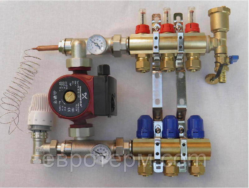 Колектор для теплої підлоги з витратоміром і насосом з одного зливний групою зроблений повністю з латуні. В комплект входять гребінки з евроконусами на кріпильної планки, коннектор під насос,змішувальний блок, одна зливна група, витратоміри, термоголовка, прямий термоклапан.