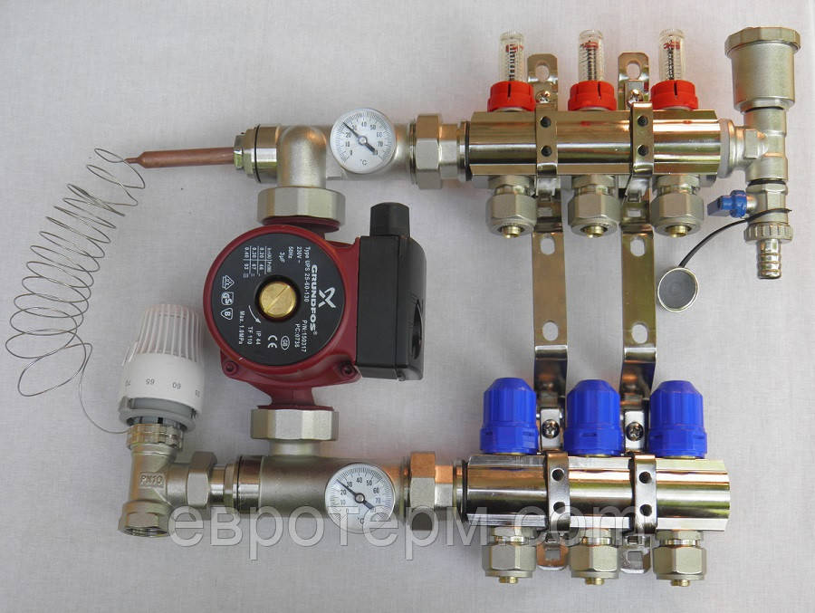Колектор для теплої підлоги з витратоміром і насосом з одного зливний групою зроблений повністю з латуні. В комплект входять гребінки з евроконусами на кріпильної планки, коннектор під насос,змішувальний блок, одна зливна група, витратоміри, термоголовка, прямий термоклапан.